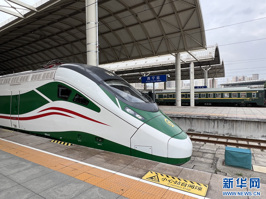 7月1日,復(fù)興號(hào)動(dòng)車組從西寧站緩緩駛出。新華網(wǎng) 魚昊 攝
