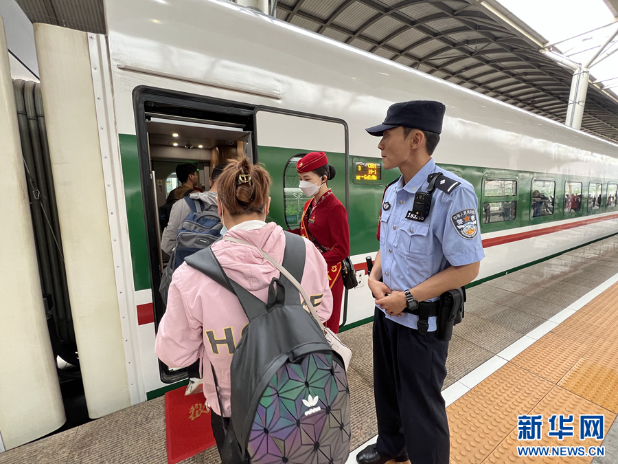 7月1日,工作人員在站臺(tái)上為出行旅客提供服務(wù)。新華網(wǎng) 魚昊 攝