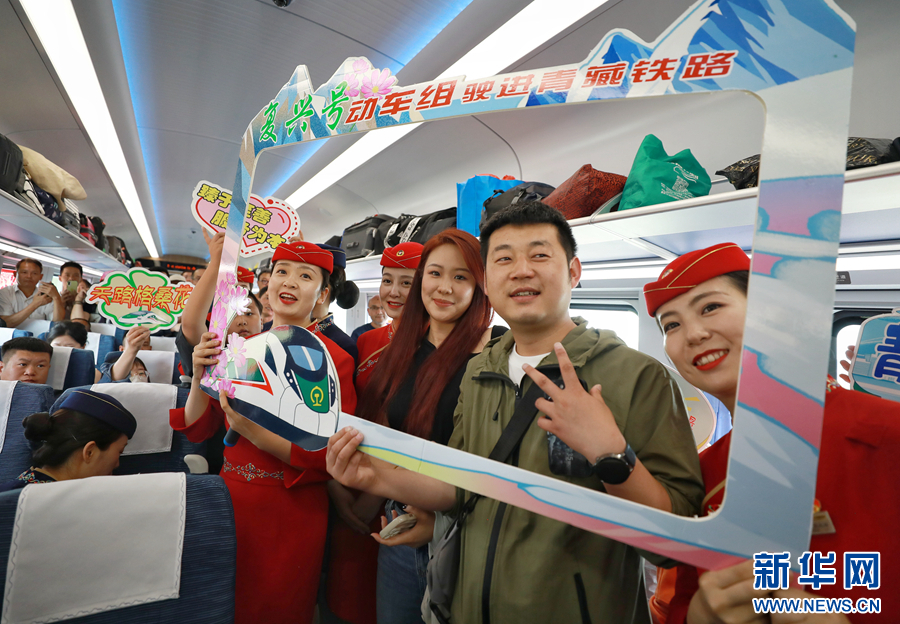 7月1日,在C891次西寧至格爾木動(dòng)車組列車上,乘客與列車工作人員拍照互動(dòng)。新華網(wǎng) 郝寶君 攝