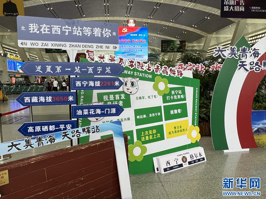 7月1日,在西寧火車站候車大廳,工作人員設(shè)置了拍照打卡點(diǎn)。新華網(wǎng) 魚昊 攝