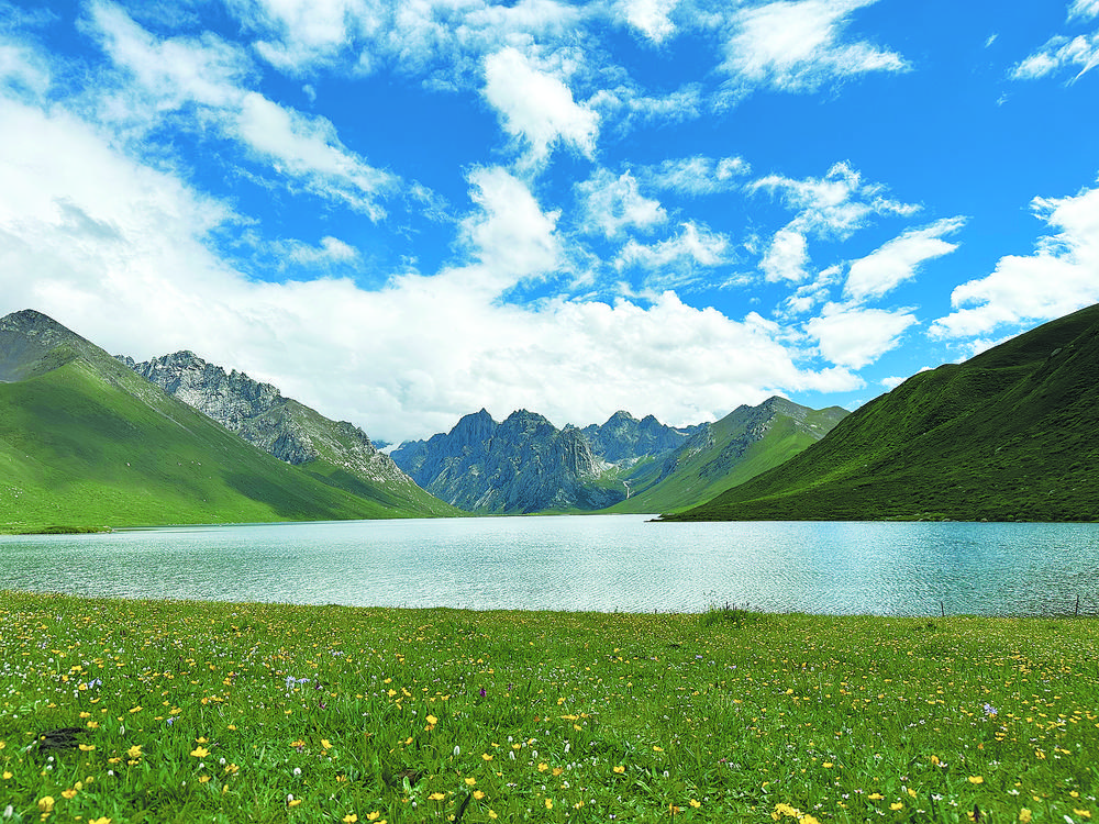 七月,本就是草原最美的季節(jié)。地處“三江之源”的果洛,此時也展現(xiàn)出它一年中最俊逸美好的樣子:潔白云朵和湛藍天空之下,大片大片綠地毯般的草原上,牦牛信步、俊鳥飛翔……車輪滾滾向前,我們離當(dāng)?shù)夭刈迦罕姺Q為“神山神水神話”的世界越來越近了,神秘浪漫的“年保玉則”近在眼前。
