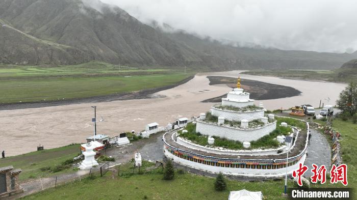 連日來雨水持續(xù),清晨的通天河挾卷泥沙,波濤涌動,河中央的月牙形沙洲被沖刷出柔美的弧線。四周群山青翠、霧靄繚繞,白塔靜靜佇立在古渡口邊,似水墨畫頗具詩意。石階延伸處,牧人緩緩走過轉(zhuǎn)經(jīng)筒,遠處村莊籠罩在一片朦朧中。