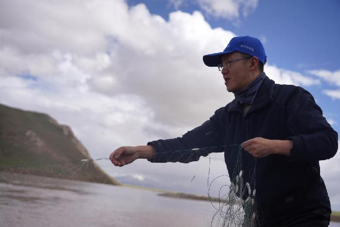 7月26日,劉晗在長(zhǎng)江源區(qū)河流采集魚類樣本。新華社記者 陳杰 攝