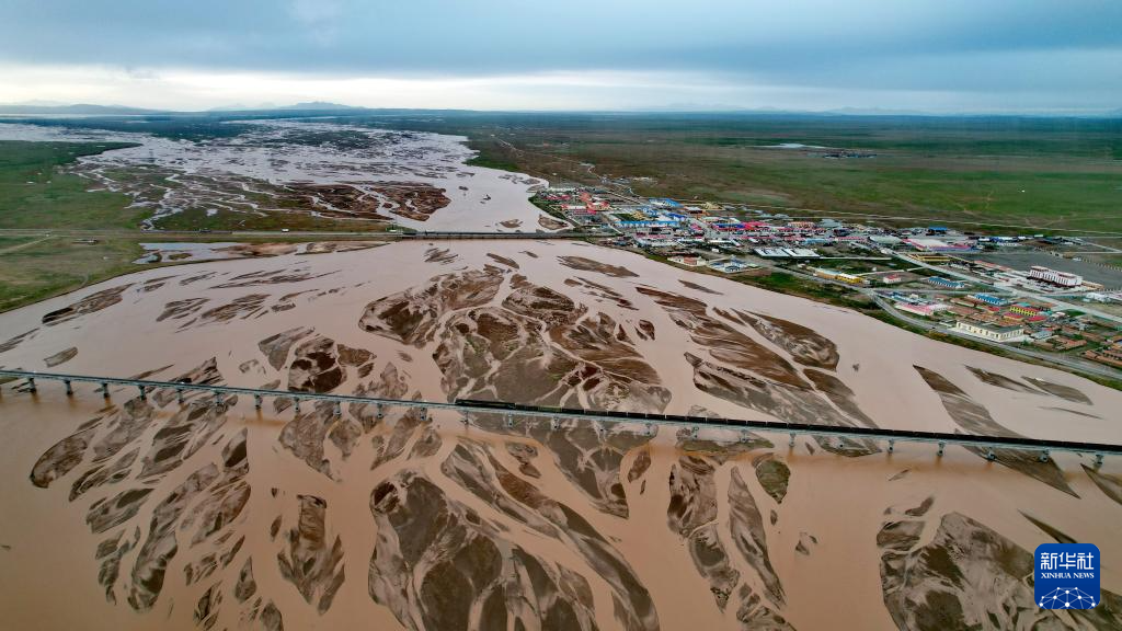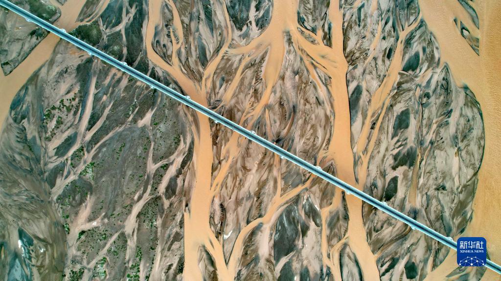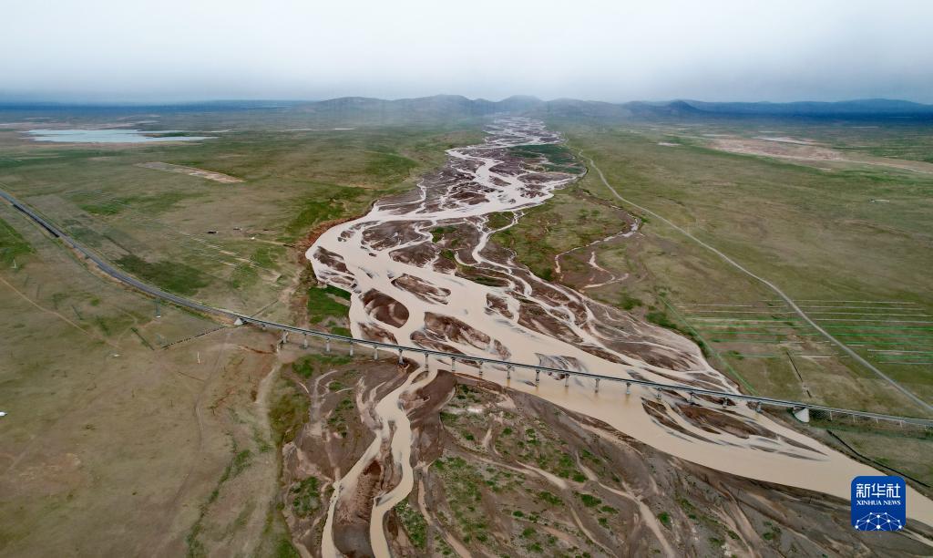 青藏鐵路跨過尕爾曲的辮狀河道(7月27日攝,無人機(jī)照片)。新華社記者 劉詩平 攝