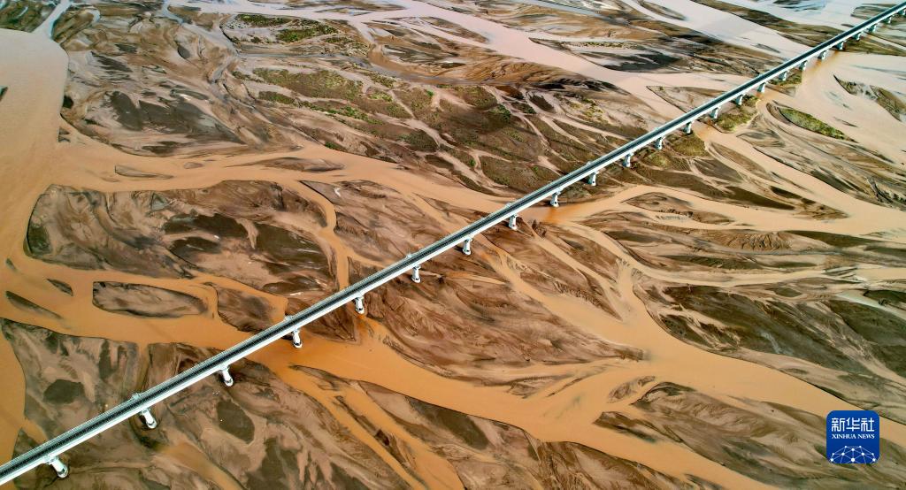 青藏鐵路跨過沱沱河的辮狀河道(7月26日攝,無人機(jī)照片)。新華社記者 劉詩平 攝