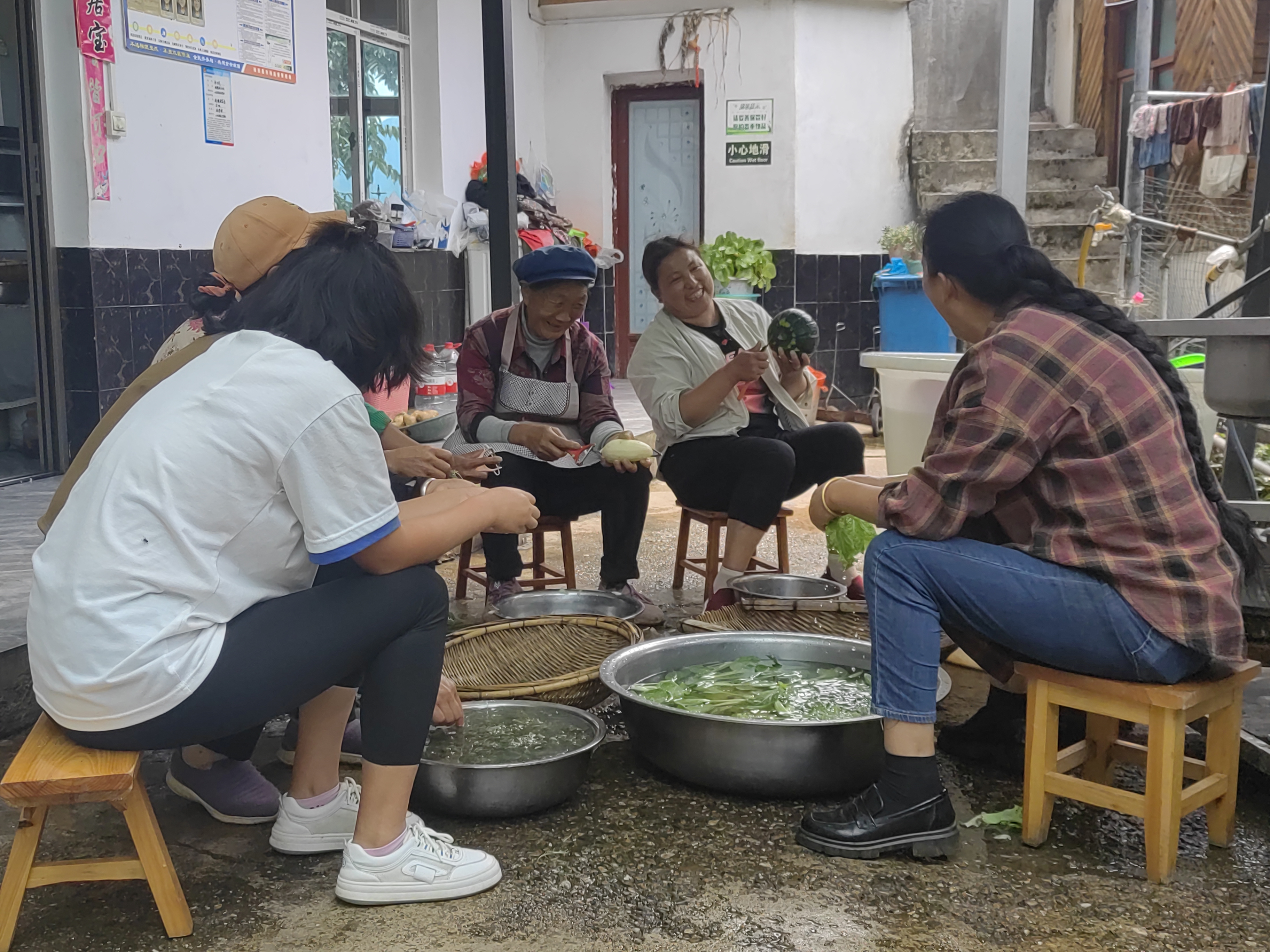 村口,一個(gè)名叫“成姐農(nóng)家樂”的小院里歡聲笑語,熱鬧非凡?!斑@是今天剛挖的洋芋和新鮮采摘的瓜,待會(huì)就給客人做一道當(dāng)?shù)氐奶厣恕瞎涎笥??!薄盁豕瞎涎笥蟮臅r(shí)候,再做個(gè)鍋邊粑粑,這樣的農(nóng)家味道客人肯定喜歡?!痹谵r(nóng)家樂里忙碌的姐妹們邊洗菜邊討論著當(dāng)天的菜品。