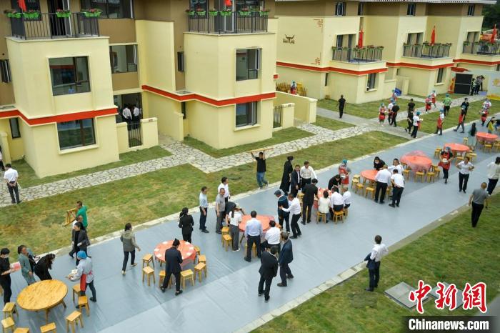 瀘定縣磨西鎮(zhèn)大杉樹村(幸福新村)集中安置點(diǎn)領(lǐng)取新房鑰匙后,村民們正在擺壩壩宴。中新網(wǎng)記者 劉忠俊 攝