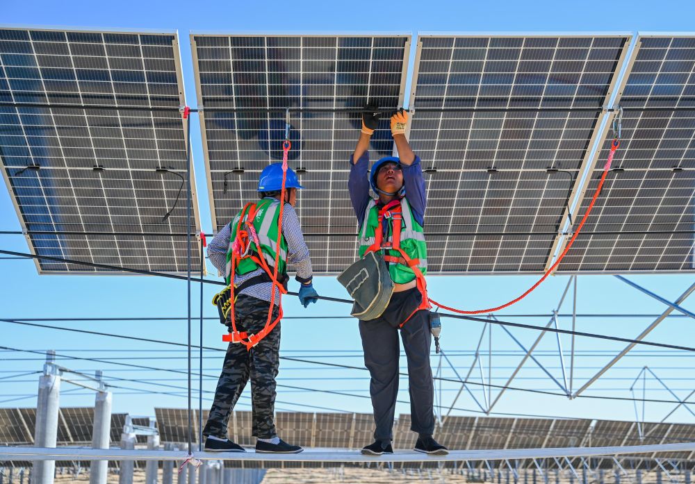 2023年7月22日,工人在位于內(nèi)蒙古杭錦旗庫布其沙漠億利生態(tài)示范區(qū)的蒙西基地庫布其200萬千瓦光伏治沙項(xiàng)目工地安裝光伏板。新華社記者 劉磊 攝