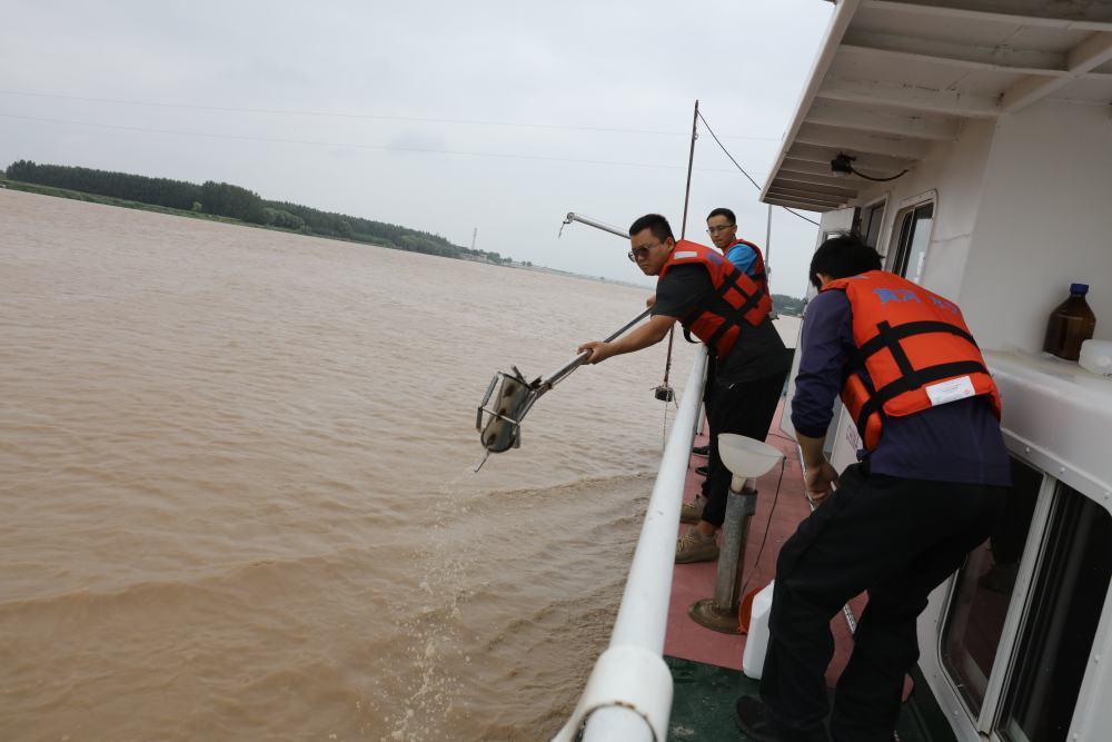 2023年6月29日,調(diào)水調(diào)沙期間,黃河下游利津水文站工作人員在進(jìn)行取沙作業(yè)。新華社記者 劉詩平 攝