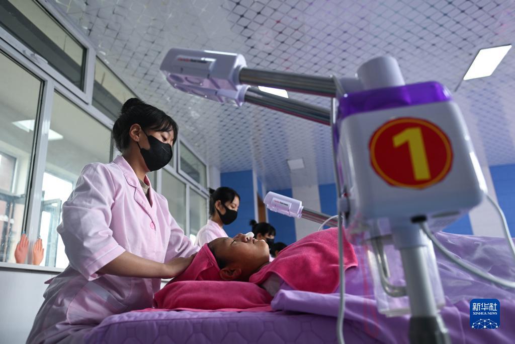 9月8日,在果洛藏族自治州職業(yè)技術(shù)學(xué)校,美發(fā)與形象設(shè)計學(xué)生在學(xué)習(xí)美容實訓(xùn)課程。新華社記者 張龍 攝