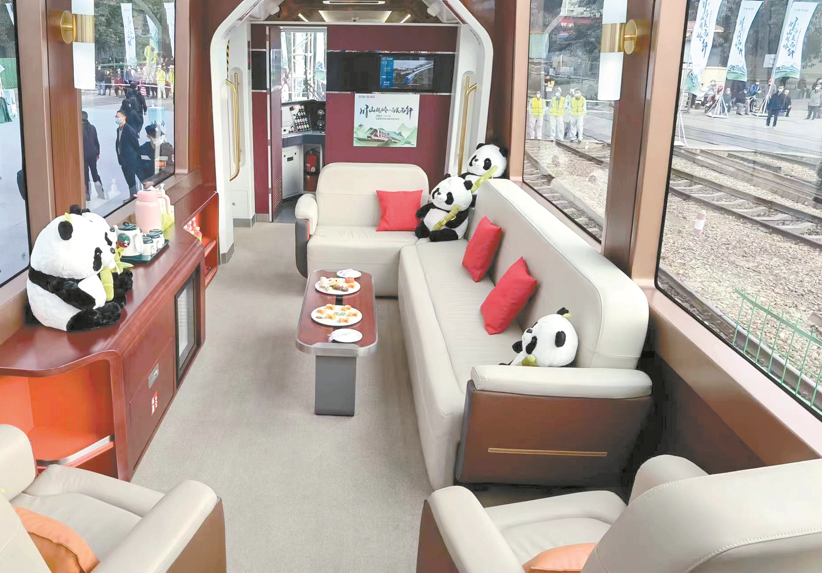 “列車采用4節(jié)編組,額定載客數(shù)145人,內飾分為豪華VIP家庭式包廂、豪華觀光卡座區(qū)、普通座區(qū)三種座位區(qū),滿足乘客多種乘車需求。它還具有國內最大面積曲面觀光玻璃窗,可實現(xiàn)車內游客與自然景觀的深度交流?!毕嚓P負責人向記者介紹道。