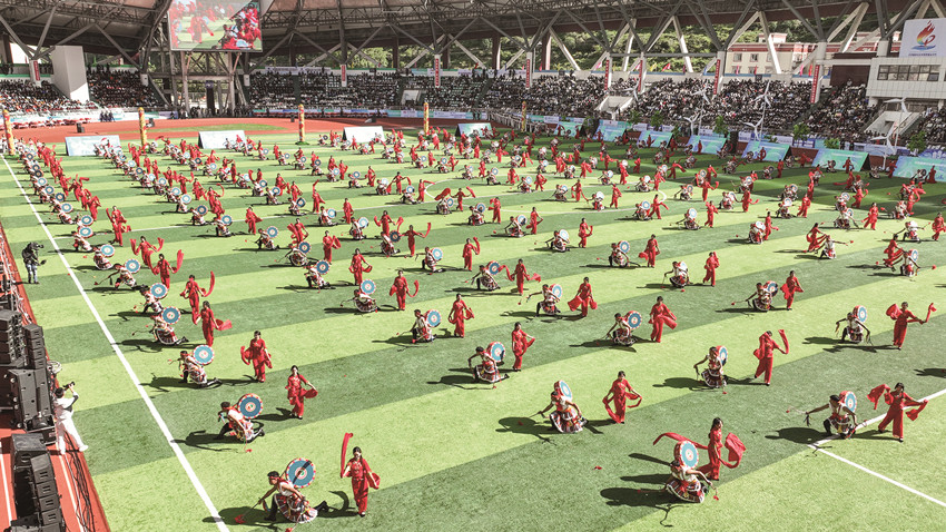 來自四川省藏文學(xué)校的小伙們熱情奔放、姑娘們可愛生姿,由他們共同演繹的這支青春動(dòng)感熱身操,瞬時(shí)點(diǎn)燃體育場(chǎng)氣氛,9000余雙眼睛注視著全場(chǎng)刮起的這輪“最炫民族風(fēng)”,觀眾席掌聲雷動(dòng)、歡呼聲響徹。