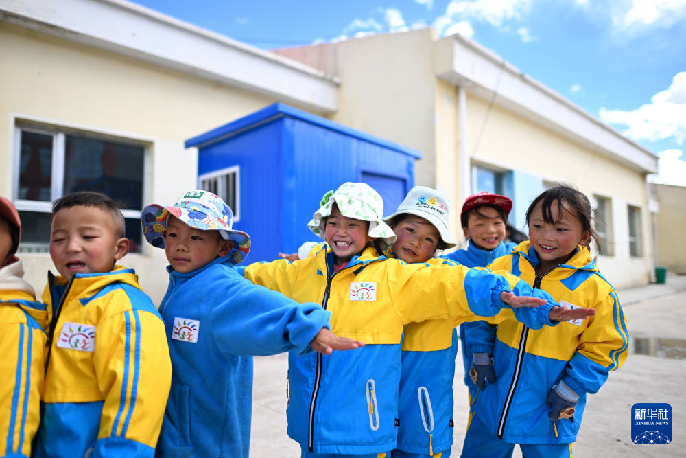 在曲麻萊縣秋智鄉(xiāng)幼兒園,小朋友們排隊(duì)玩游戲(9月13日攝)。新華社 韓方方 攝