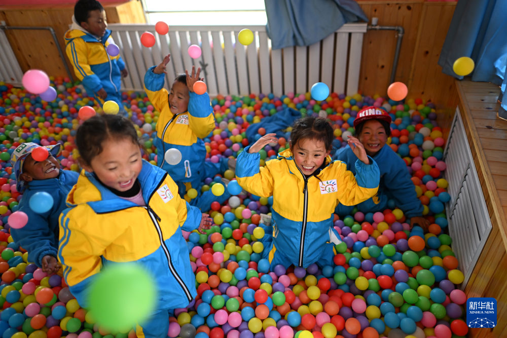 在曲麻萊縣秋智鄉(xiāng)幼兒園,昂文拉毛(右二)和伙伴們在教室內(nèi)玩耍(9月13日攝)。新華社 張宏祥 攝