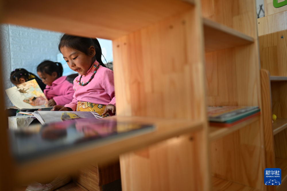 在曲麻萊縣麻多鄉(xiāng)幼兒園,美多永藏(右一)在課堂上閱讀繪本(9月20日攝)。新華社 張宏祥 攝