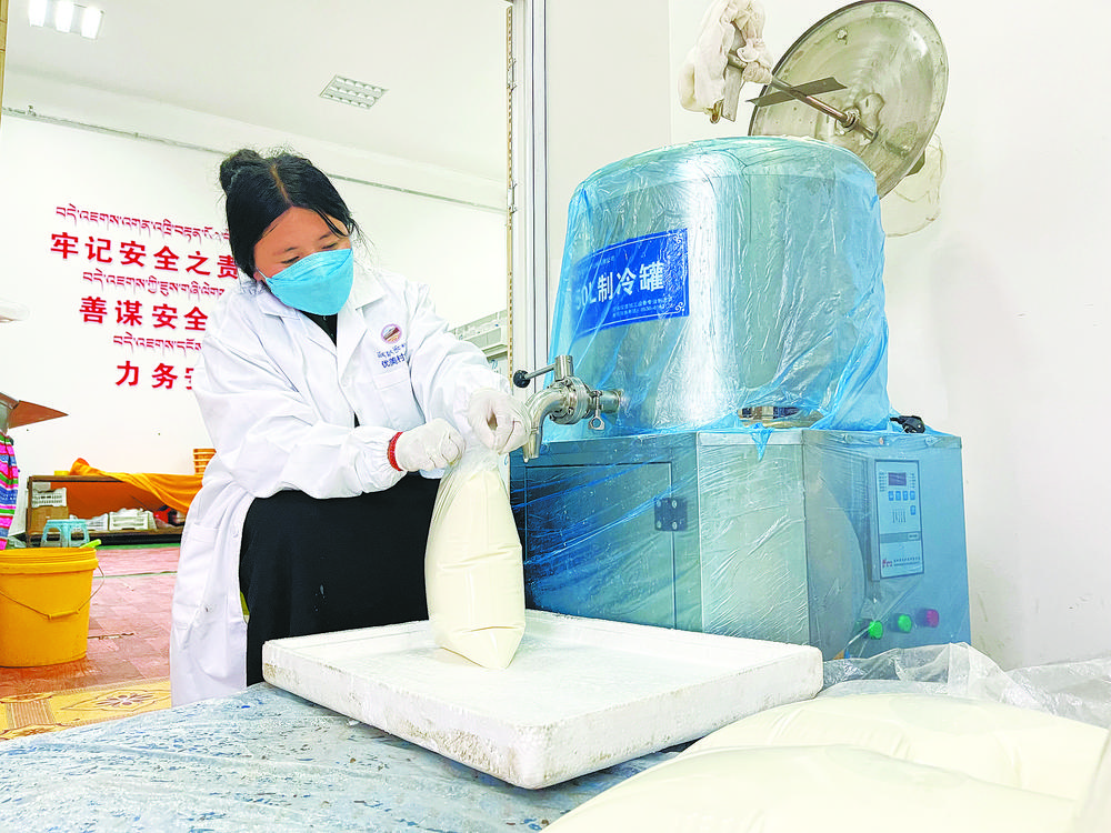 牦牛養(yǎng)得壯,乳制品、肉制品等延伸產(chǎn)品同樣生產(chǎn)加工忙。廠房內(nèi),工人白忠正在灌裝新鮮的牦牛奶,這些鮮奶可以在銷售點現(xiàn)賣,還能冷凍儲存待銷售?!瓣笈D虪I養(yǎng)價值高,做成酸奶、奶干更能讓大眾接受。牦牛奶和乳制品是合作社的搶手產(chǎn)品,銷售得好,我們的收入也提高了,現(xiàn)在生活過得有滋有味?!?/p>