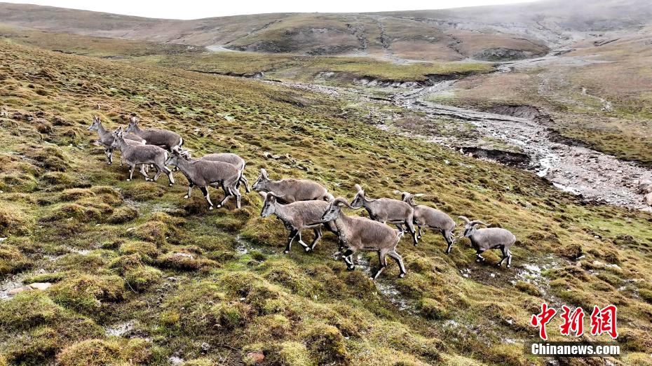 圖為成群巖羊在草原上散步。