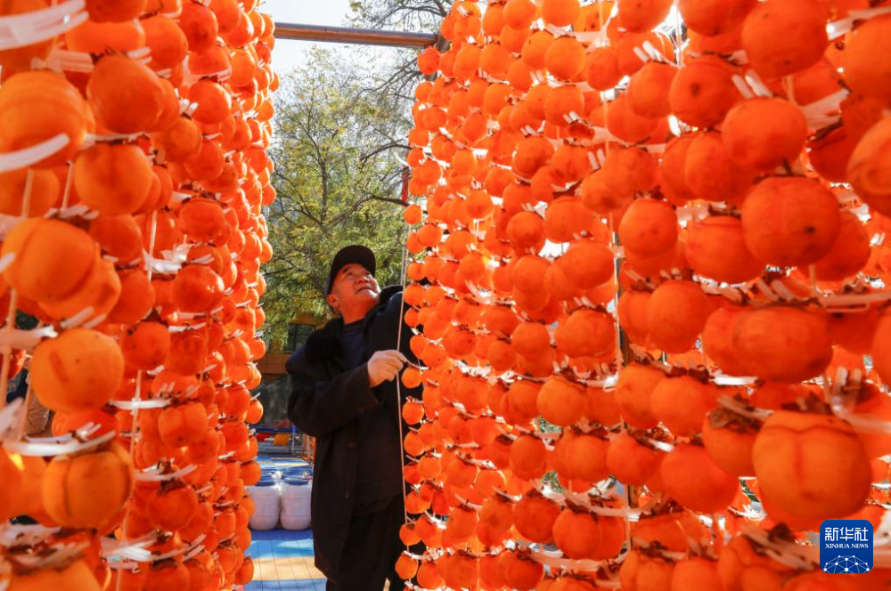 11月14日,在甘肅省甘南藏族自治州舟曲縣立節(jié)鎮(zhèn)杰迪村,村民在晾曬柿子。新華社記者 方欣 攝
