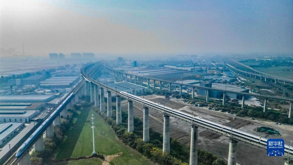 11月28日,首發(fā)列車C6008次列車行駛在川青鐵路上,該段與成萬高速并行、與成都都市圈環(huán)線高速交會(huì)(無人機(jī)照片)。新華社記者 江宏景 攝