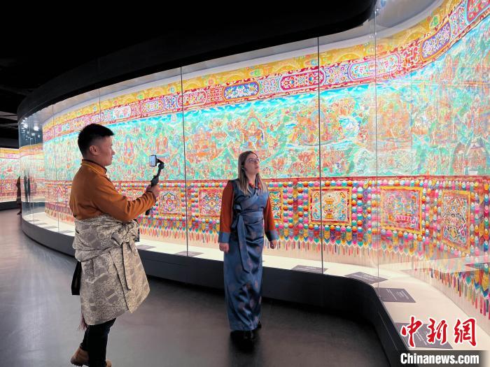 圖為中外文旅達(dá)人身著藏族服飾參觀《中國藏族文化藝術(shù)彩繪大觀》。馬銘言 攝