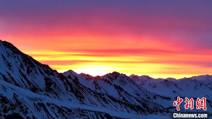 冬日高原,寒風蕭瑟。近日,攝影師在位于祁連山腹地的青海省海北藏族自治州祁連縣和門源縣境內,用鏡頭記錄下祁連山多彩壯麗的日出景觀。清晨,祁連山的雪線之上,銀白的曙光漸漸顯出緋紅,朝霞映在每一個山巒,祁連縣民眾眼中的“神山”牛心山,在朝霞的映襯下純凈透徹。門源縣境內的崗什卡雪峰在晨曦中逐漸顯露“面容”,天空也在陽光的照射下顯得多彩夢幻,連綿的祁連山在此刻盡顯磅礴氣勢。
