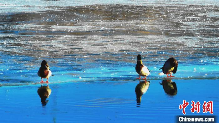 高原冬日,在位于青海湖北岸的青海省海北藏族自治州海晏縣境內(nèi),成群的赤麻鴨、綠頭鴨等鳥類現(xiàn)身青海省東大灘水庫,它們時而“泡湯”洗浴,時而振翅高飛,時而覓食嬉戲,展現(xiàn)出一幅冬日和諧的美好畫面。近年來,越來越多鳥類來到青海湖北岸覓食休憩,此時一半冰層一半碧波的東大灘水庫成了鳥類覓食的好去處。