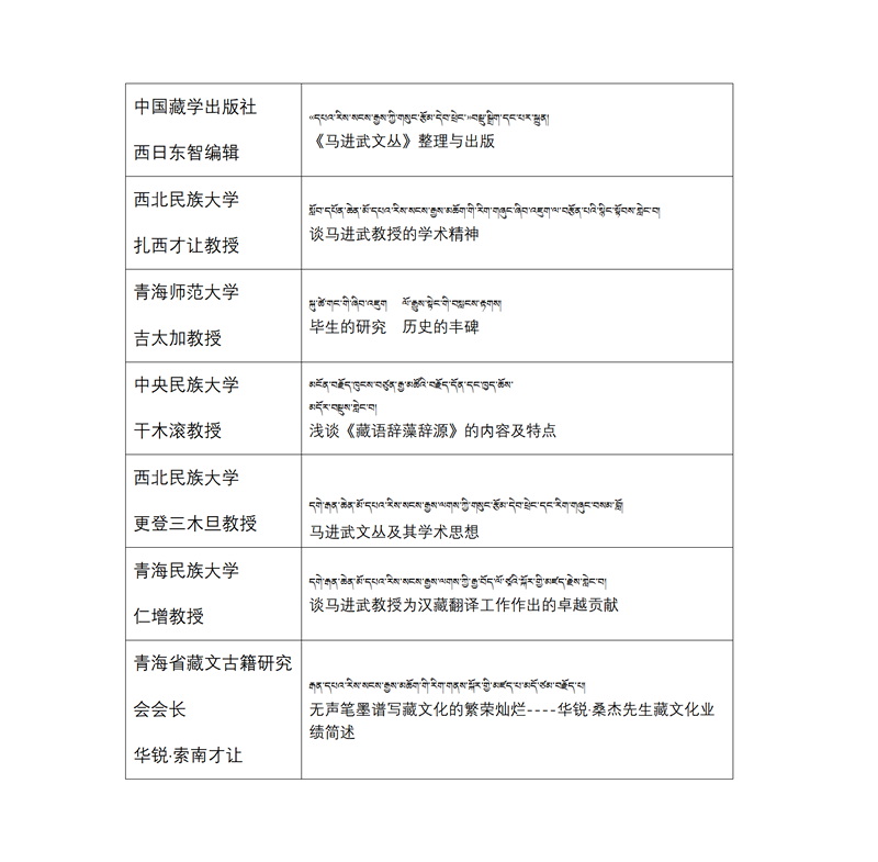 中國藏學(xué)研究中心原副總干事洛桑靈智多杰,青海省省志辦原總編、藏文古籍研究會名譽(yù)會長謝佐,西北民族大學(xué)科研處副處長英加布,甘肅省藏學(xué)研究學(xué)會副會長傅千吉,宗拉昌瓦公司總經(jīng)理扎西加等專家學(xué)者對《馬進(jìn)武文叢》的學(xué)術(shù)水平和現(xiàn)實(shí)意義給予了高度評價(jià),認(rèn)為該系列叢書不僅體現(xiàn)并傳承了馬進(jìn)武先生的學(xué)術(shù)思想,而且在推動(dòng)新時(shí)代藏語文研究和藏漢翻譯事業(yè)發(fā)展、促進(jìn)學(xué)術(shù)合作,推動(dòng)民族語言學(xué)學(xué)科繁榮和進(jìn)步等方面,具有高度的學(xué)術(shù)性和現(xiàn)實(shí)意義。西藏自治區(qū)藏醫(yī)院副院長銀巴研究員、四川民族出版社社長澤仁扎西、青海師范大學(xué)原副校長扎布教授、夏壩·嘉央克珠、甘肅華銳剛乃旦才讓、青海民族大學(xué)旦正教授、青海民族出版社副社長阿寧·扎西東主等對《馬進(jìn)武文叢》的出版發(fā)行表示祝賀。