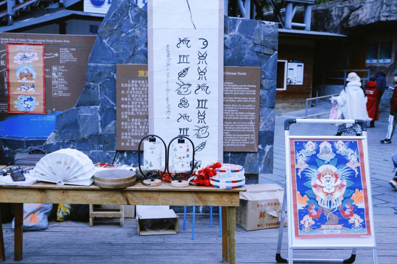 圖為非物質文化傳承人和桂全現(xiàn)場演示納西族傳統(tǒng)造紙術,展示東巴畫、十二生肖布畫、東巴鼓等非遺產品,并免費為游客寫東巴文、畫十二生肖。