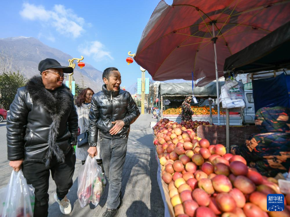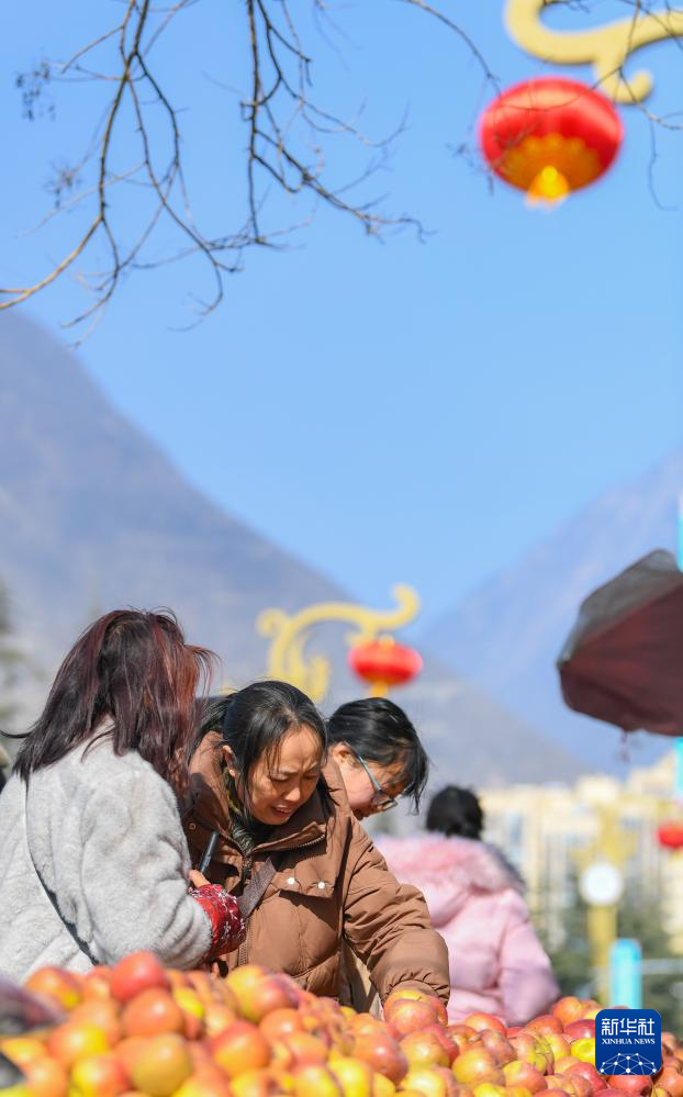 1月28日,在四川阿壩藏族羌族自治州茂縣水果交易市場(chǎng),來(lái)自成都的游客在選購(gòu)蘋(píng)果。新華社記者 王曦 攝