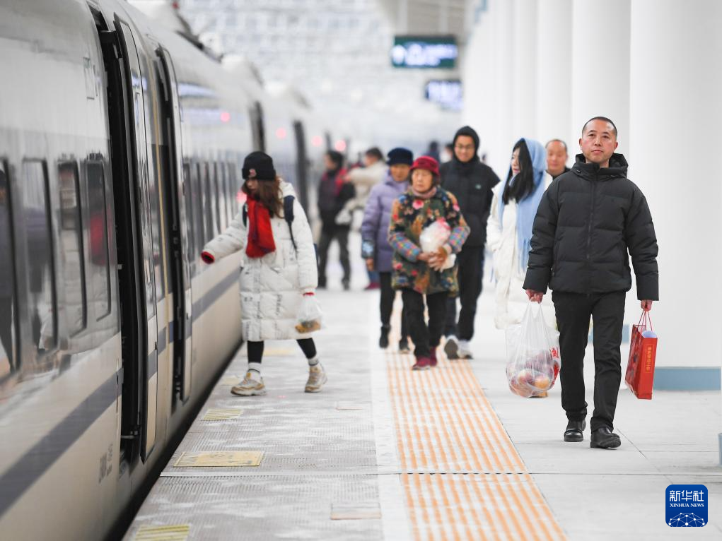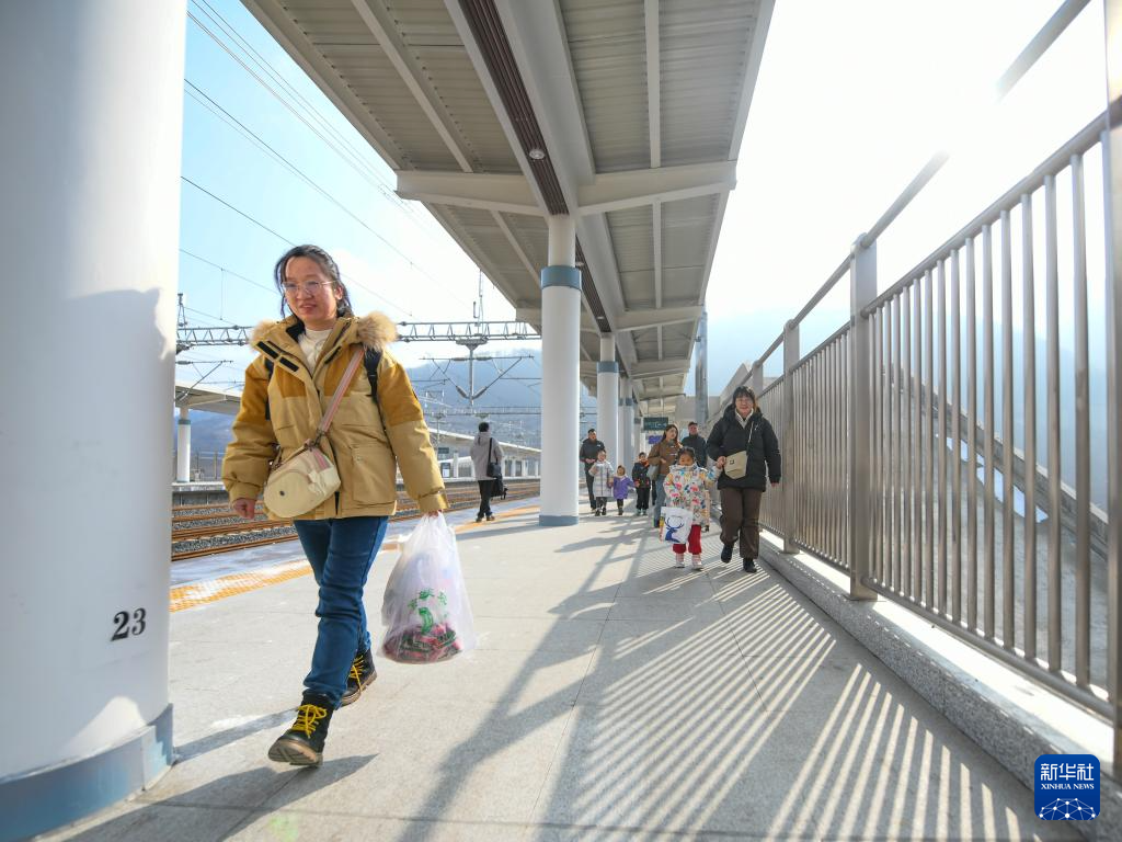 1月28日,在川青鐵路茂縣站,旅客帶著購(gòu)買(mǎi)的蘋(píng)果準(zhǔn)備登車(chē)。新華社記者 王曦 攝