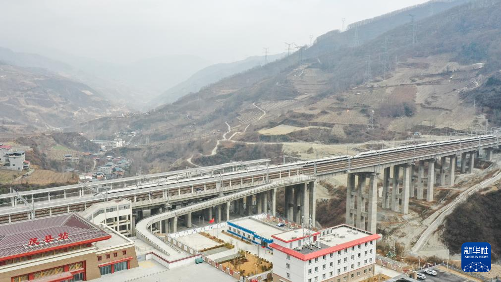 1月28日,一列動(dòng)車(chē)組駛出川青鐵路茂縣站(無(wú)人機(jī)照片)。新華社記者 王曦 攝