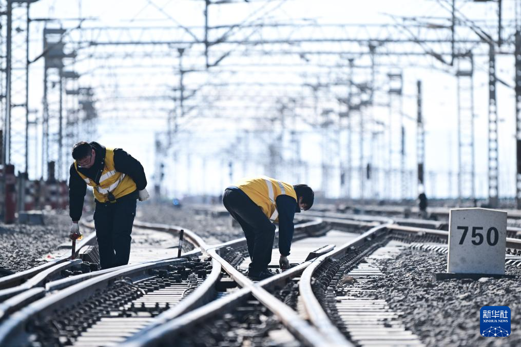 1月29日,格爾木電務段格爾木東信號車間察爾汗信號工區(qū)職工楊正宏(左)和胡進海在對察爾汗站道岔進行檢修作業(yè)。新華社記者 張龍 攝