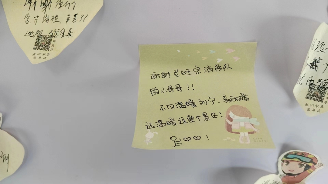隊(duì)員們細(xì)致暖心的幫助與關(guān)懷,讓兩位遠(yuǎn)方的朋友萬(wàn)分感激,并主動(dòng)在“藍(lán)焰貼心服務(wù)留言墻”留下了他們最簡(jiǎn)單最純真最溫暖的話語(yǔ):“謝謝尼旺宗消防隊(duì)的小哥哥,不僅溫暖劉寧、郭麗媛,還溫暖這整個(gè)景區(qū)!”