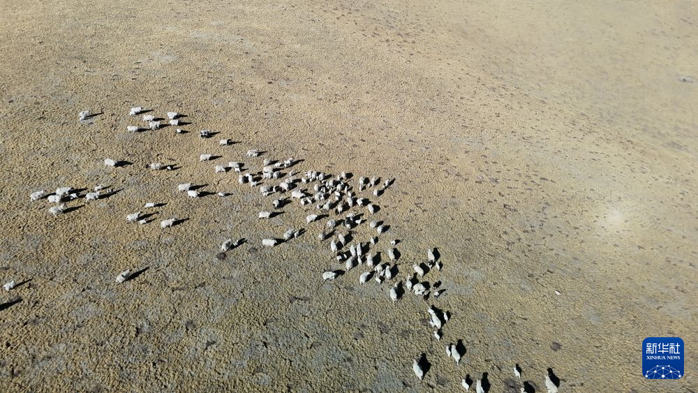 1月27日,在青海省海北藏族自治州剛察縣泉吉鄉(xiāng)寧夏村,羊群正在覓食(無人機(jī)圖片)。任元昊 攝
