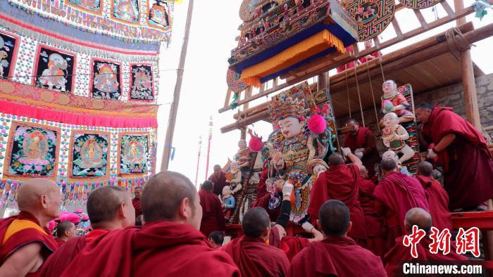 18時許,僧人分別從上、下花院肩扛手抬,喊著號子,將一塊塊酥油花“拼”出全貌。上花院《至尊宗喀巴大師偉績——八十偈贊頌》和下花院《十六尊者之一注荼半托迦尊者的故事》躍然花架之上。酥油花四周,中國“非遺”堆繡搭起的方形天棚豐富精美。