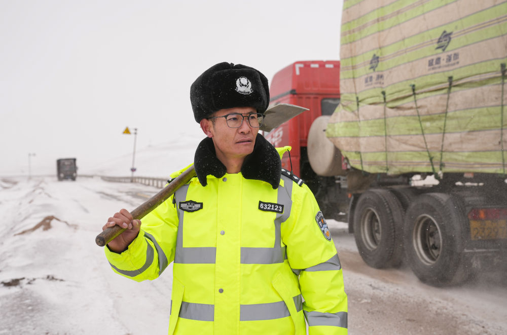 安多交警大隊(duì)秩序中隊(duì)隊(duì)長(zhǎng)達(dá)娃云旦在冰雪路段緊盯過(guò)往車輛(2024年2月1日攝)。新華社記者 晉美多吉 攝