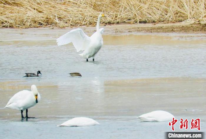 3月5日,驚蟄時(shí)節(jié),黃河上游的青海省海南藏族自治州貴德縣境內(nèi)的千姿湖濕地,數(shù)百只天鵝嬉戲覓食,振翅遨游。
