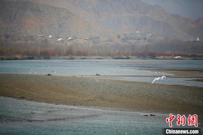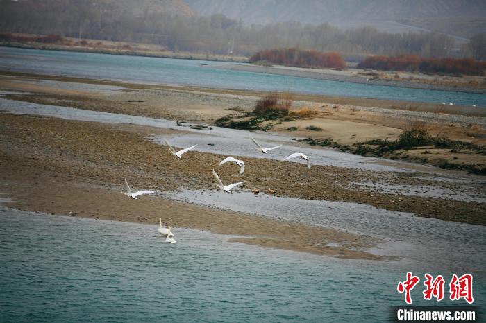 青海:野生大天鵝群在黃河越冬 高原冬日添靚景