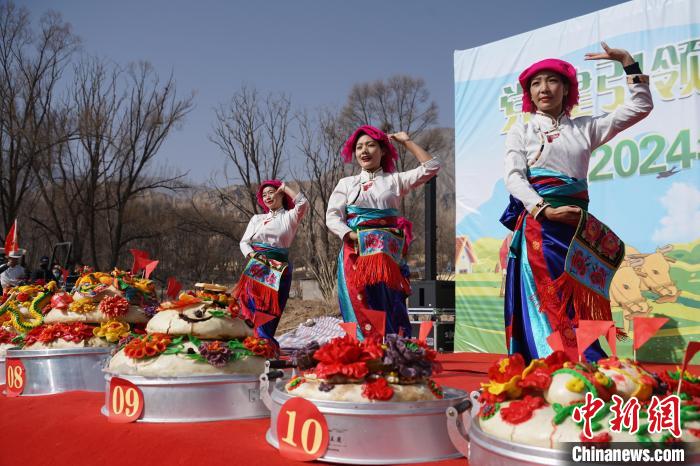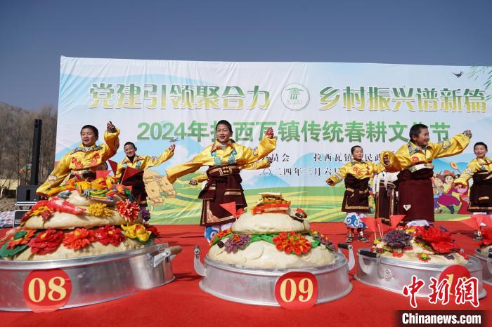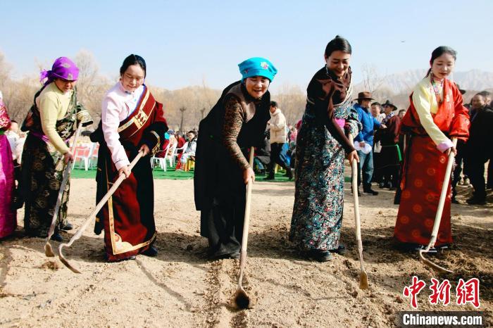 3月6日,青海省海南藏族自治州貴德縣拉西瓦鎮(zhèn)舉辦春耕文化節(jié)活動(dòng)。該鎮(zhèn)十個(gè)村的村民身穿節(jié)日盛裝,手捧制作精美、色彩鮮艷,寓意風(fēng)調(diào)雨順、五谷豐登的“彤糕”來(lái)到田間,以“二牛抬杠”的傳統(tǒng)方式開(kāi)啟今春“第一犁”。