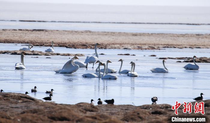 3月13日,青海省海南藏族自治州共和縣境內的青海湖泉灣濕地,大天鵝沐浴春日暖陽。隨著天氣轉暖,大天鵝、斑頭雁、赤麻鴨等水鳥聚集在青海湖泉灣濕地,時而振翅飛翔、時而戲水覓食,鳴叫聲不絕,為仍處于冰封的青海湖增添生機和活力。