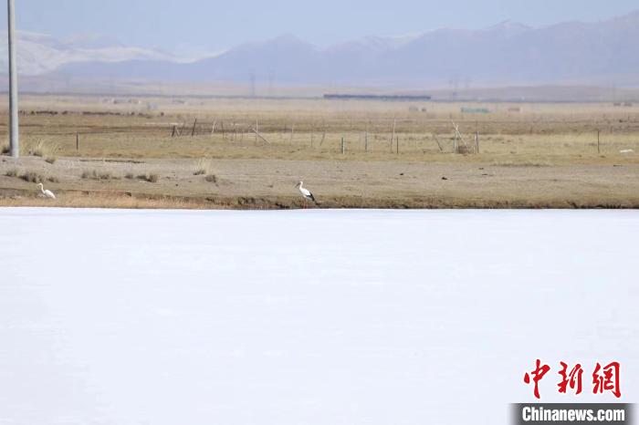 3月27日,東方白鸛在青海湖畔。(青海湖國(guó)家級(jí)自然保護(hù)區(qū)管理局供圖)