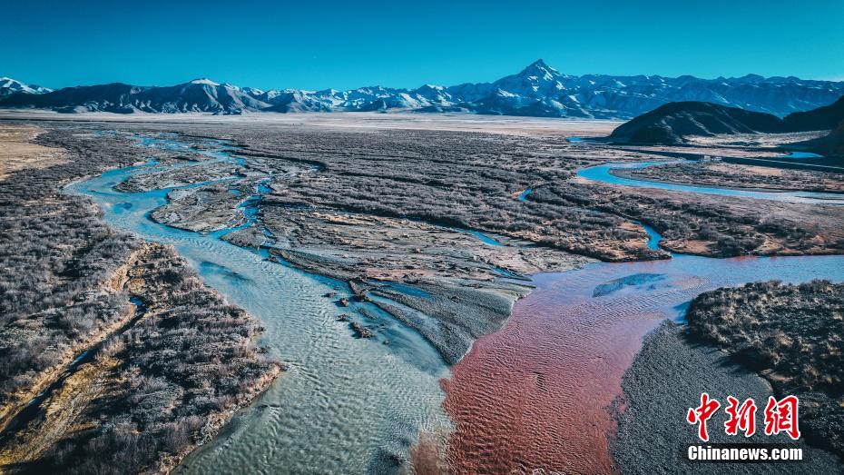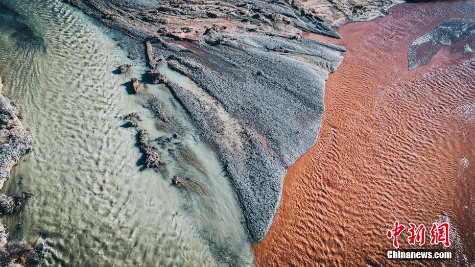 4月7日,攝影愛好者在青海省海西州都蘭縣香加鄉(xiāng)洪水川交匯處拍攝到兩條河流“涇渭分明”的景觀。