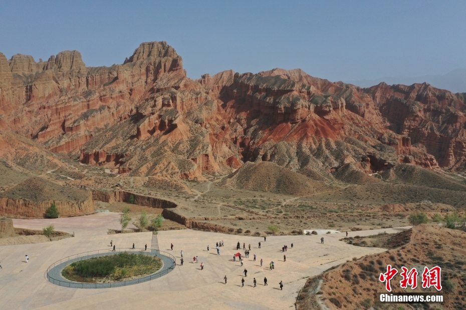 4月15日,游客在位于青海省海南藏族自治州貴德縣境內(nèi)的青海貴德國(guó)家地質(zhì)公園游覽。該地質(zhì)公園以自然地貌景觀和地質(zhì)遺跡為主,丹霞地貌悠久奇特。(無(wú)人機(jī)照片)中新社記者 馬銘言 攝