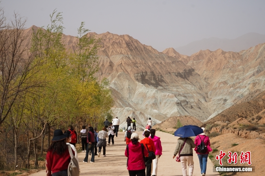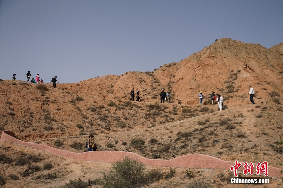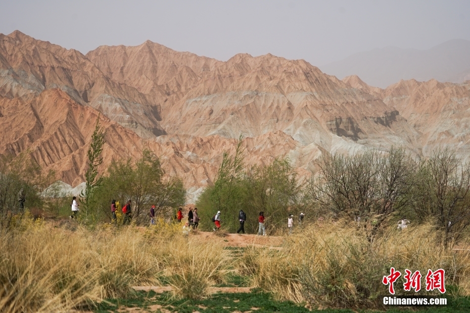 4月15日,游客在位于青海省海南藏族自治州貴德縣境內(nèi)的青海貴德國(guó)家地質(zhì)公園游覽。該地質(zhì)公園以自然地貌景觀和地質(zhì)遺跡為主,丹霞地貌悠久奇特。中新社記者 馬銘言 攝