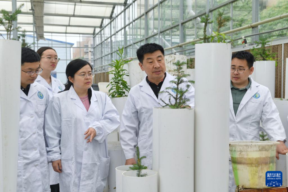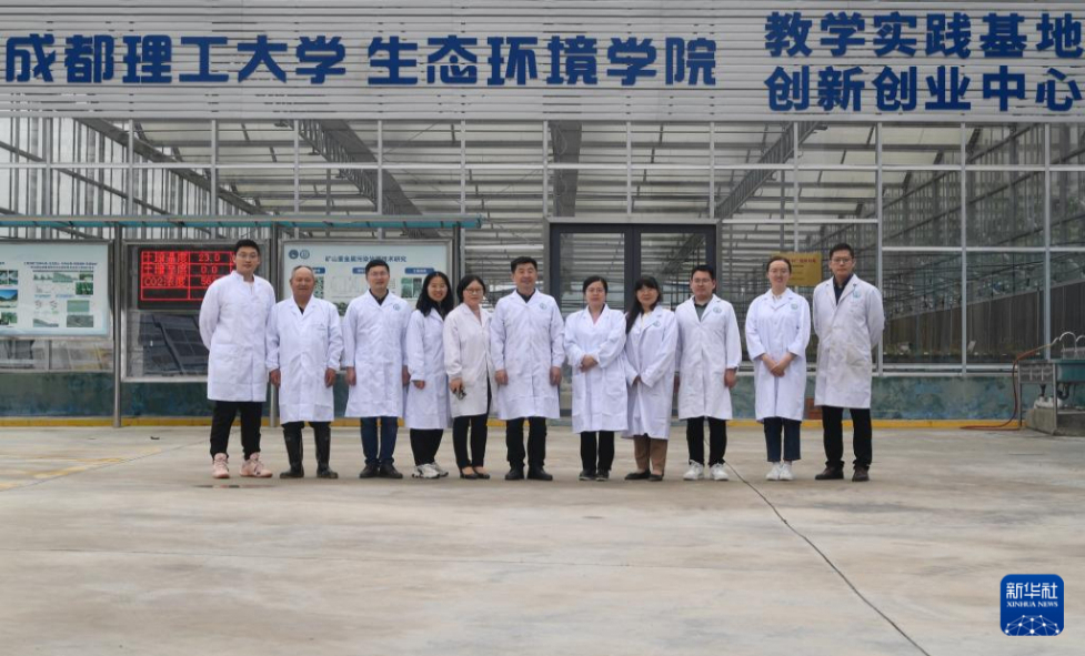 4月20日,在成都理工大學(xué)生態(tài)環(huán)境學(xué)院教學(xué)實踐基地內(nèi),裴向軍(左四)及團隊成員在討論礦山生態(tài)修復(fù)盆栽實驗。新華社記者 劉坤 攝