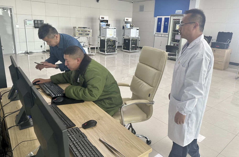 瓦里關(guān)中國(guó)大氣本底基準(zhǔn)觀象臺(tái)工作人員在查看觀測(cè)數(shù)據(jù)(2024年3月19日攝)。新華社記者 王金金 攝