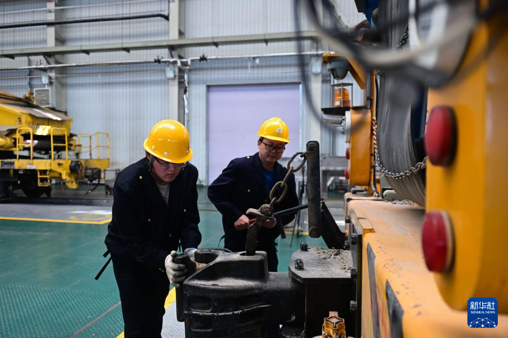 4月25日,中國鐵路青藏集團有限公司西寧工務(wù)機械段職工在檢查車鉤。新華社記者 張龍 攝