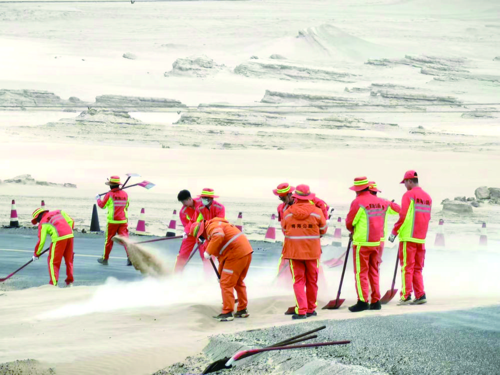 養(yǎng)路工在清理蔓延上道路的砂石。馬振東 攝