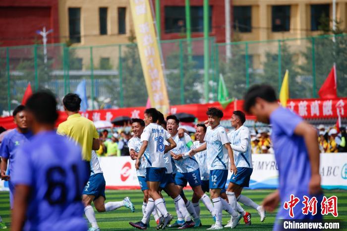 圖為比賽現(xiàn)場,海北祁連山藏羊隊(duì)(白衣)慶祝進(jìn)球。馬銘言 攝