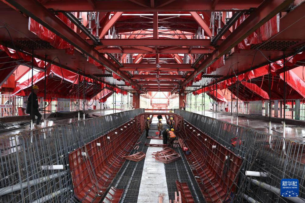 6月3日,中鐵四局的建設者在西成鐵路甘肅段白龍江大橋上施工作業(yè)。新華社記者 陳斌 攝